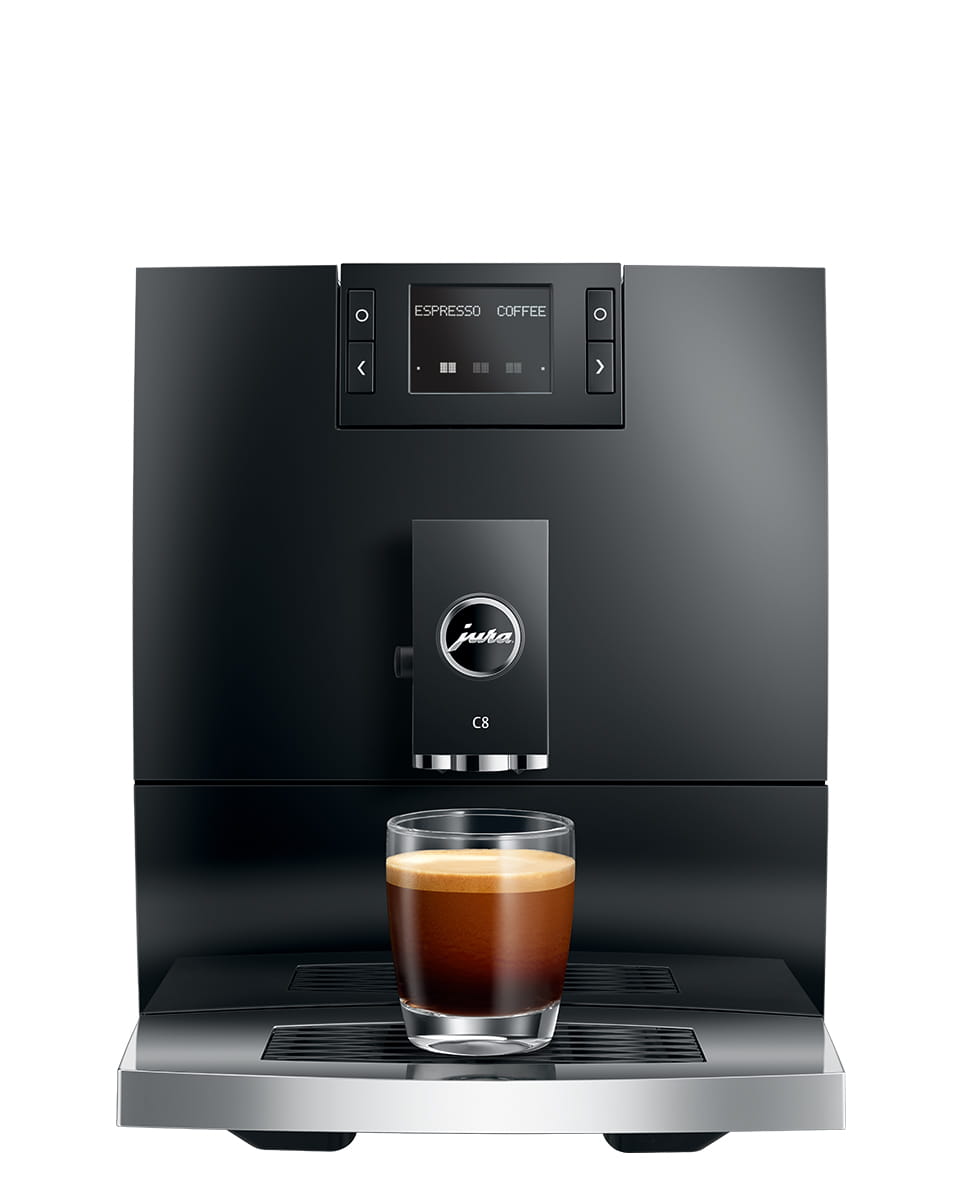 Jura C8 – Machine à café à grains reconditionnée – Machine à café à grains automatique reconditionnée par Créma : contrôles complets, nettoyage, remplacement des pièces d’usure si nécessaire.