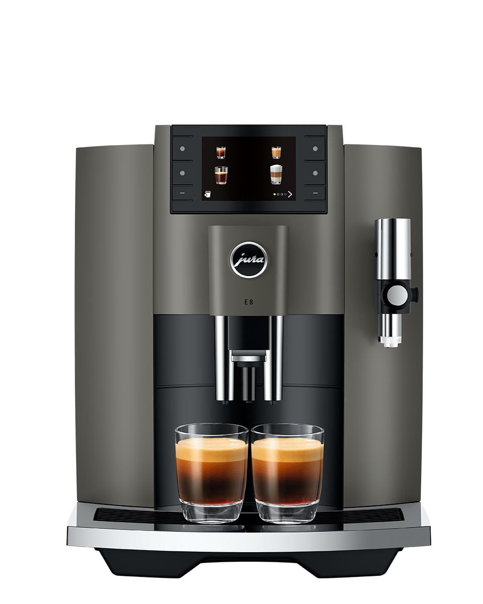 Jura E8 – Machine à café à grains reconditionnée – Machine à café à grains automatique reconditionnée par Créma : contrôles complets, nettoyage, remplacement des pièces d’usure si nécessaire.