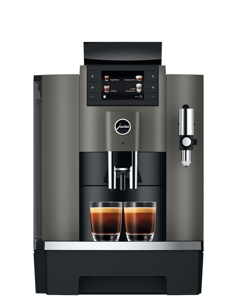 Jura W8 – Machine à café à grains reconditionnée – Machine à café à grains automatique reconditionnée par Créma : contrôles complets, nettoyage, remplacement des pièces d’usure si nécessaire.
