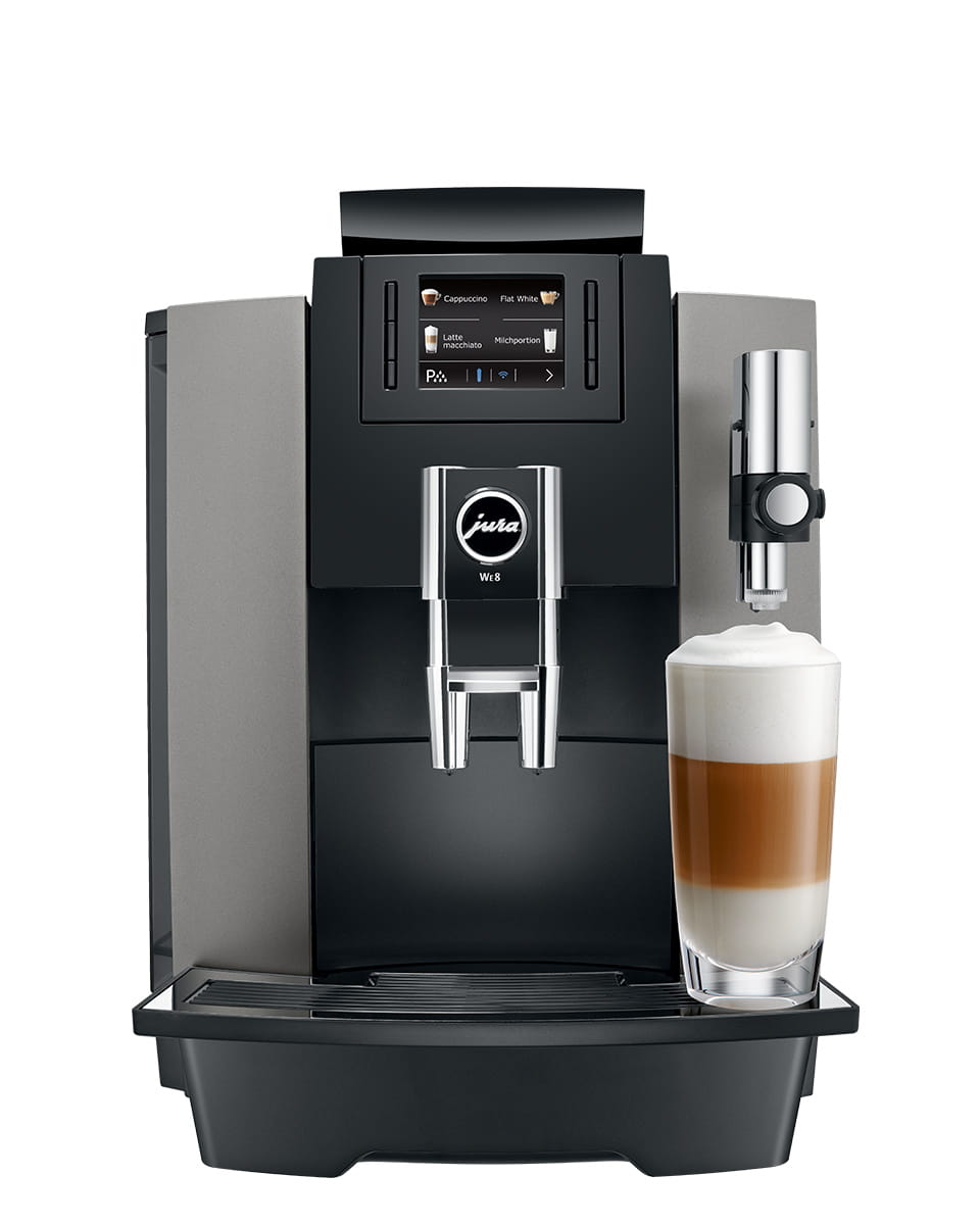 Jura WE8 – Machine à café à grains reconditionnée – Machine à café à grains automatique reconditionnée par Créma : contrôles complets, nettoyage, remplacement des pièces d’usure si nécessaire.